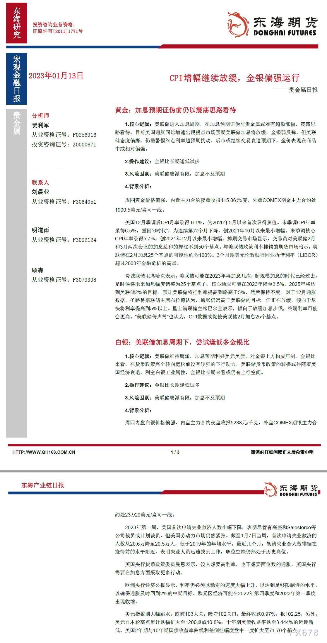 【东海期货1月13日产业链日报】贵金属篇:CPI增幅继续放缓,金银偏强运行|美联储