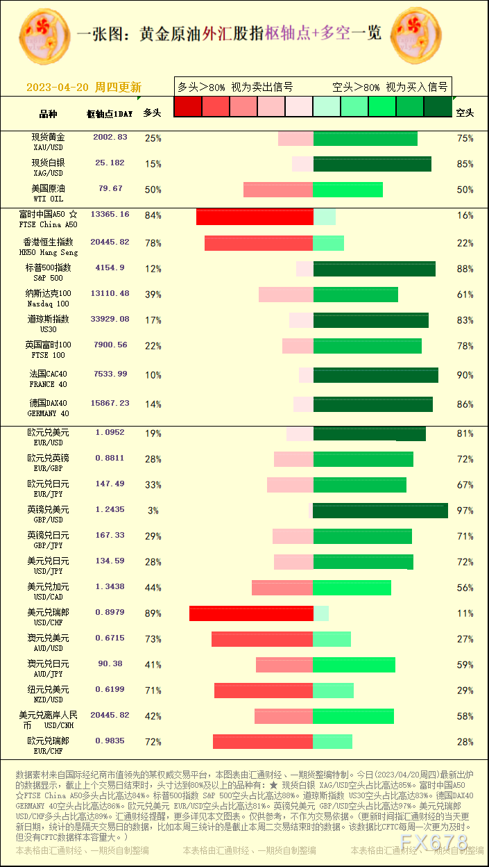 一张图:黄金原油外汇股指"枢纽点+多空占比"一览(2023/04/20周四)