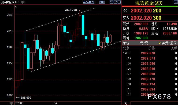 日线上看,金价处于自3月下旬开启的上行震荡通道中,隔夜再次下测通道下沿,证明支撑有效,并重新升破2000美元关口。金价下一道阻力上看4月17日高点2015美元以及2020美元整数位。