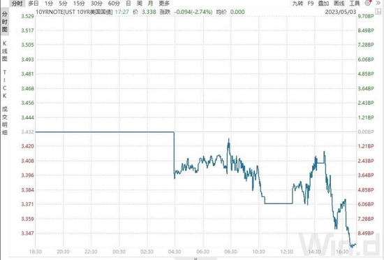 美债收益率普遍收跌,3月期美债收益率跌7.29个基点报5.155%,2年期美债收益率跌17.1个基点报3.811%,3年期美债收益率跌18.1个基点报3.505%,5年期美债收益率跌16.1个基点报3.295%,10年期美债收益率跌9.4个基点报3.338%,30年期美债收益率跌3.3个基点报3.679%。