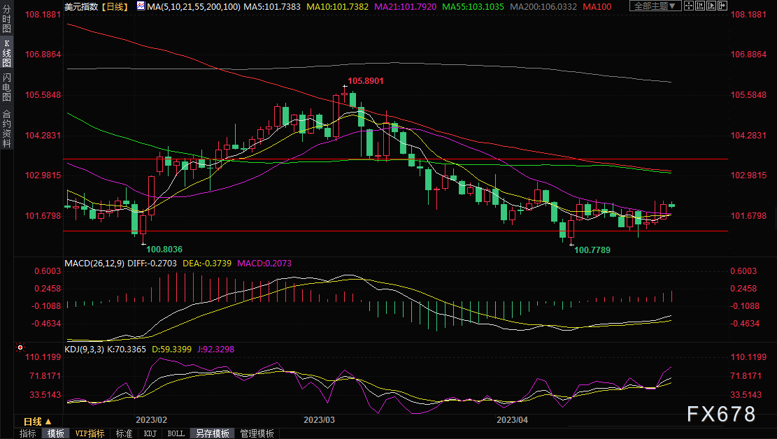 美元指数周一纽约尾盘上涨0.5%,报102.11,稍早曾达到102.19的4月19日以来最高。