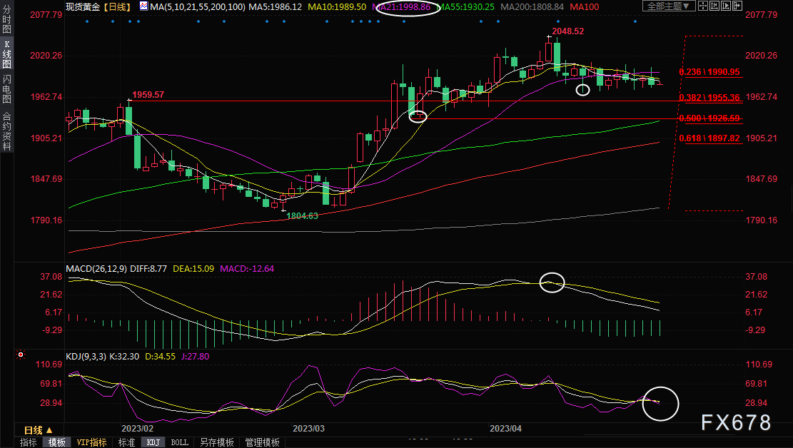 整体来看,美联储本周利率决议前,美元和美债收益率偏向强势,金价隔夜再度冲高回落后,士气受挫明显,日线级别21日均线对金价压制明显,5日均线和10日均线初步拐头向下,MACD死叉信号延续,KDJ重新结成死叉,短线金价下行风险有所增加,可能会跌破4月19日触及的近一个月低点1969.14附近支撑,并进一步跌向1934-1950区域。
