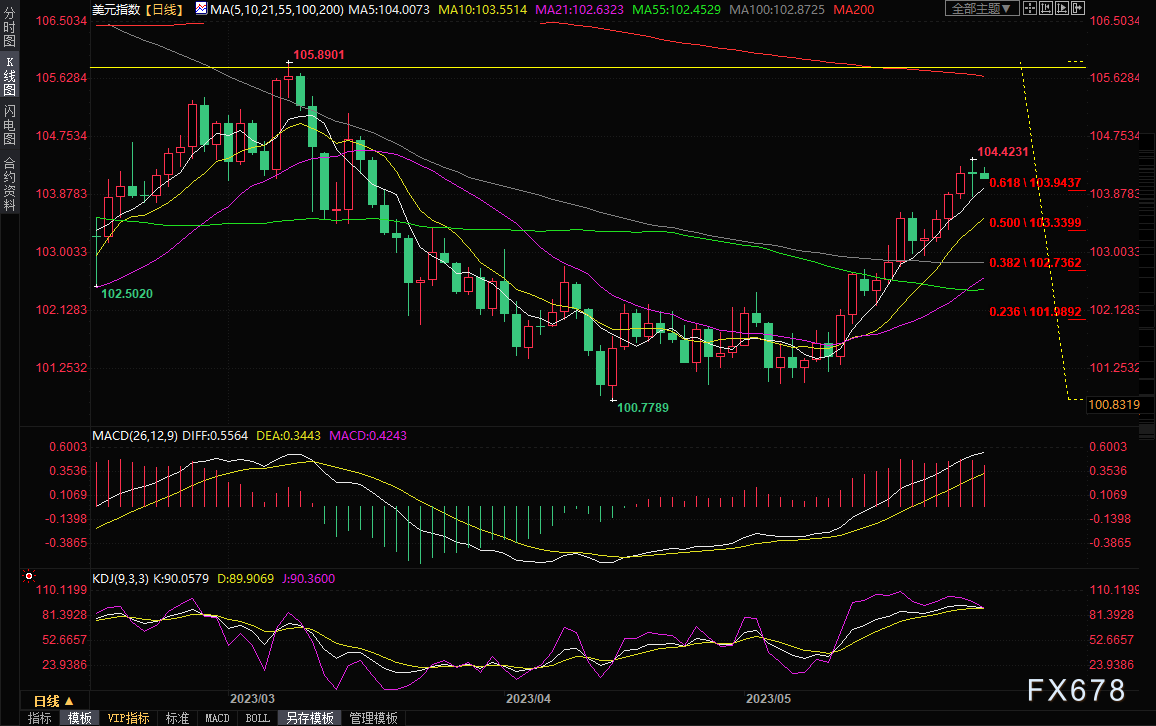 美元上周五冲高回落,盘中一度创逾两个月新高至104.42,尾盘接近收平,收报104.22,但周线势将连续第三周上涨,因上周一系列的经济数据和美联储官员鹰派讲话,市场提高了对利率将在更长时间内维持高位的押注。