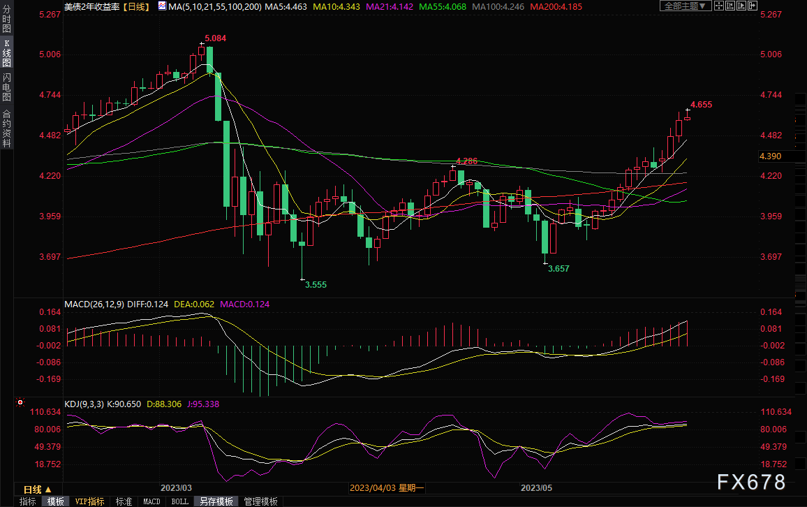通常追随利率预期的两年期国债收益率上周五跳升5.2个基点,至4.562%,为连续第三周上周,周一亚市,该收益率继续冲高,最高触及4.655%,为3月10日以来新高。