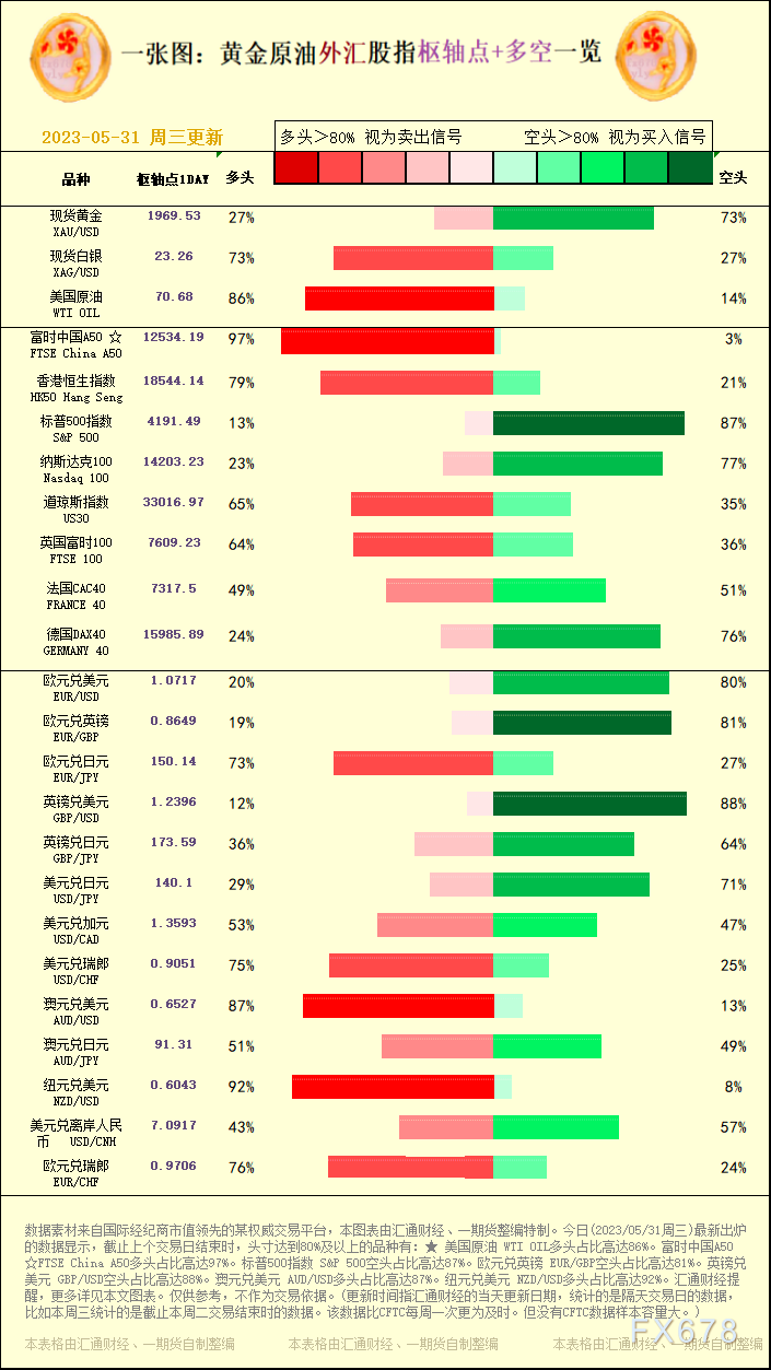 一张图:2023/05/31黄金原油外汇股指"枢纽点+多空占比"一览|美元