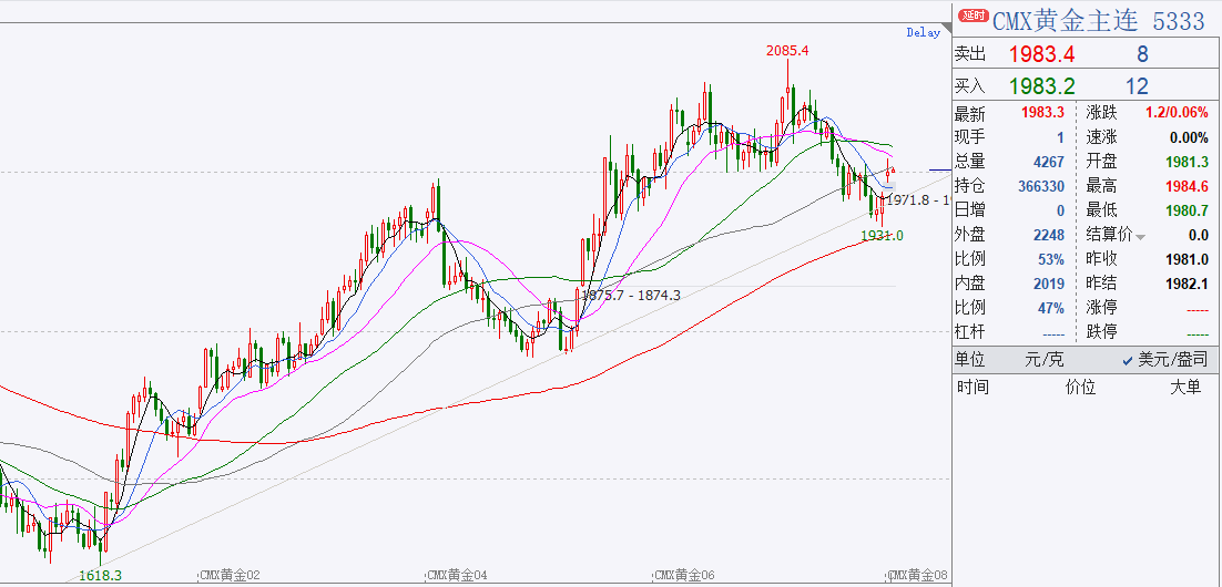 国际衍生品智库分析师认为,操作上,黄金价格高位震荡,COMEX黄金短期预计在1950-2080区间波动,短期位于震荡区间中下沿附近,建议观望或企稳做多,COMEX白银价格短期反弹至技术性阻力位,预计延续震荡筑底行情,建议观望或参与空黄金多白银套利。