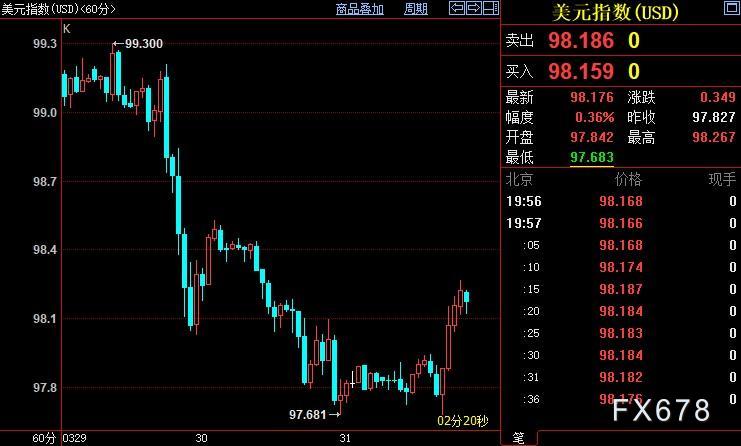北京时间19:57,现货黄金下跌0.09%至1930.67美元/盎司;COMEX期金主力合约下跌0.20%至1935.2美元/盎司;美元指数上涨0.36%至98.183。