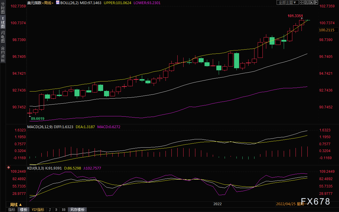 美元上周五(4月22日)刷新逾两年高位至101.33,继续从美联储主席鲍威尔上周四的言论中获得支撑,上周五收报101.22,周线涨幅0.49%,为连续第三周上涨,而且过去11周有9周均收涨。今年以来, 美元指数已经上涨了5.7%。