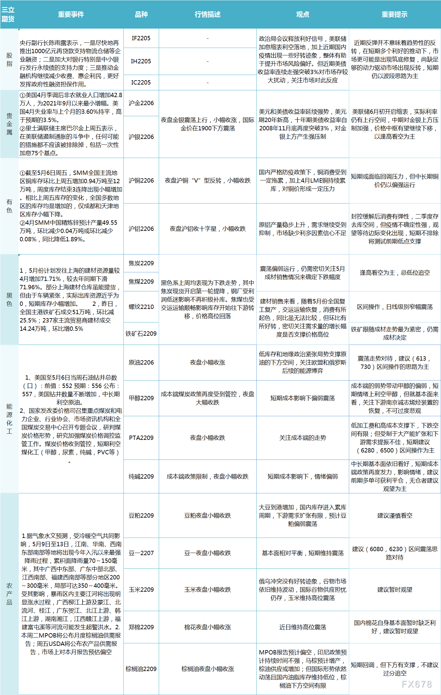 三立期货5月9日早评:一张图尽览股指、贵金属、能源化工、农产品、有色和黑色系预测|期货 来源:正大期货 作者:正大国际期货 时间:2022-05-09 三立期货5月9日早评:一张图尽览股指、贵金属、能源化工、农产品、有色和黑色系预测。