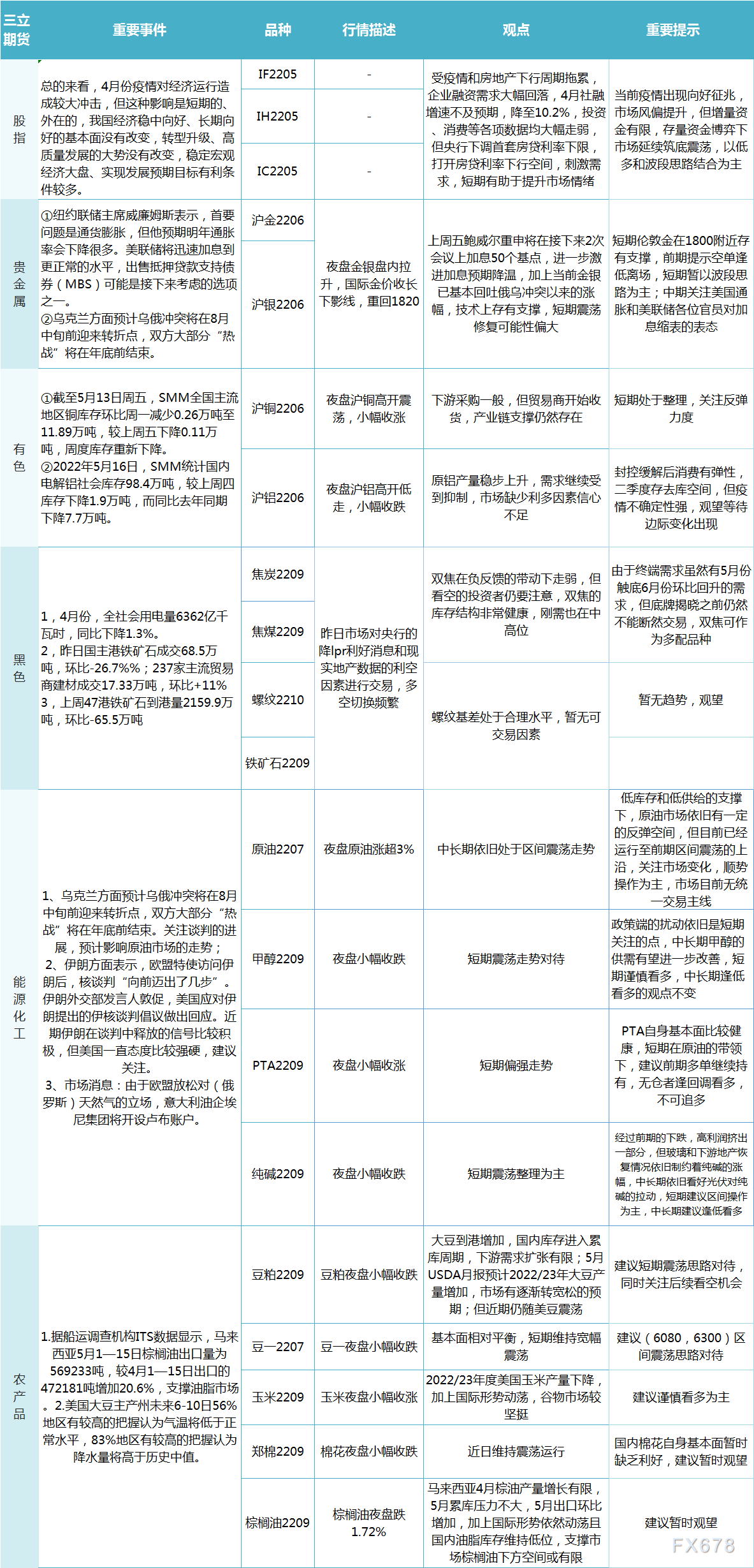 三立期货5月17日早评:一张图尽览股指、贵金属、能源化工、农产品、有色和黑色系预测|期货 来源:正大期货 作者:正大国际期货 时间:2022-05-17 三立期货5月17日早评:一张图尽览股指、贵金属、能源化工、农产品、有色和黑色系预测。