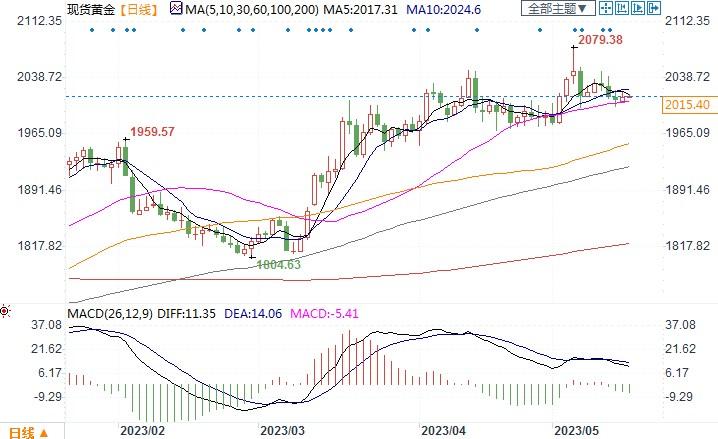 现货黄金日线图北京时间5月16日13:08,现货黄金报2016.08美元/盎司