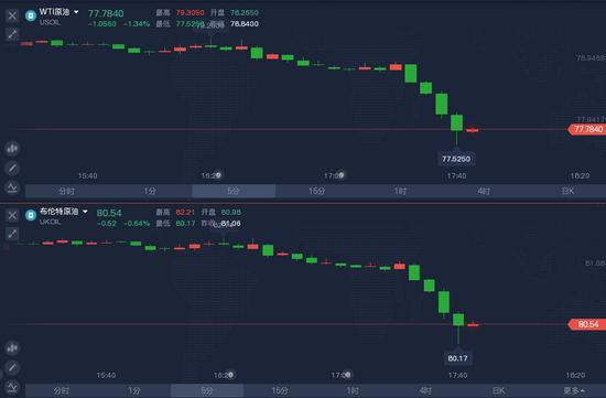 布伦特原油期货短线重挫1.8美元,报80.4美元/桶,WTI原油期货短线下挫1.2美元,现报78.37美元/桶。