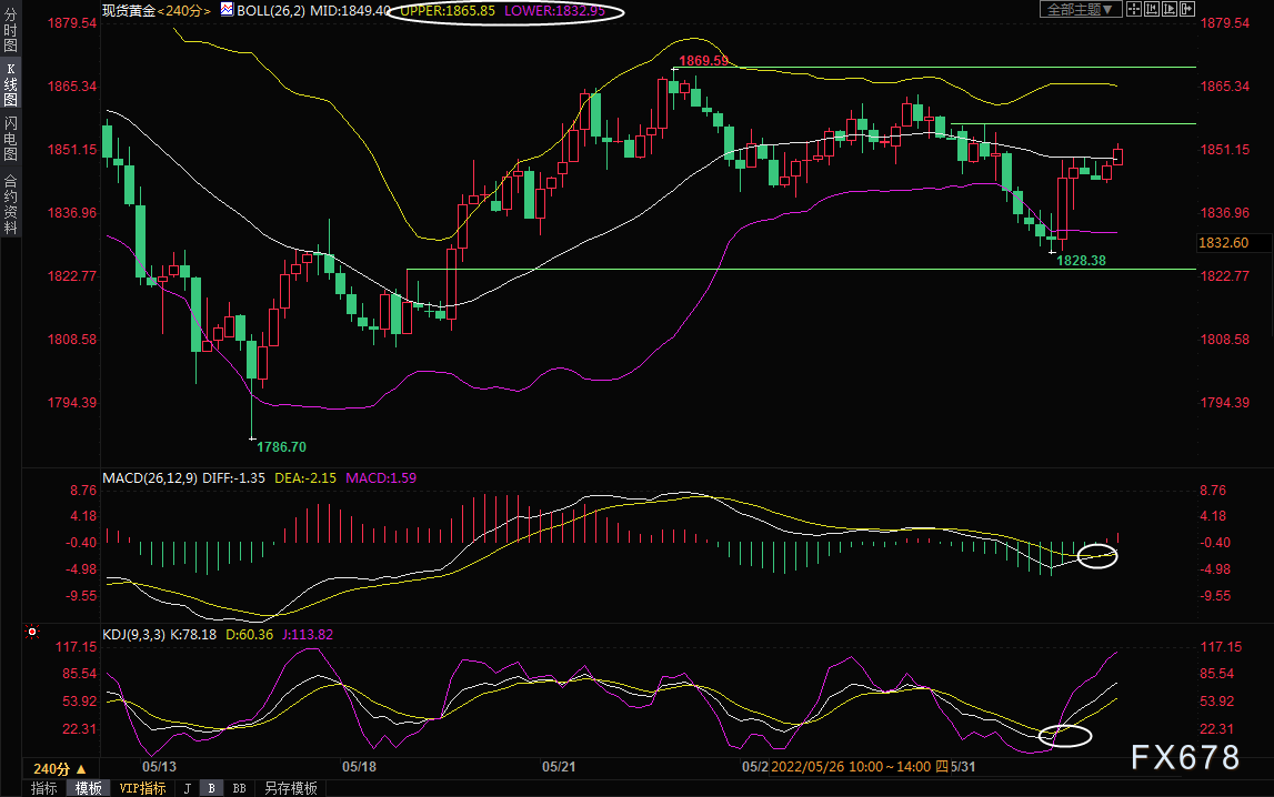 4小时级别:震荡;MACD金叉,KDJ金叉,布林线轨道水平运行,目前初步顶破布林线中轨,如果能够守在布林线中轨1849.40上方,后市有望进一步试探布林线上轨1865.85附近阻力。