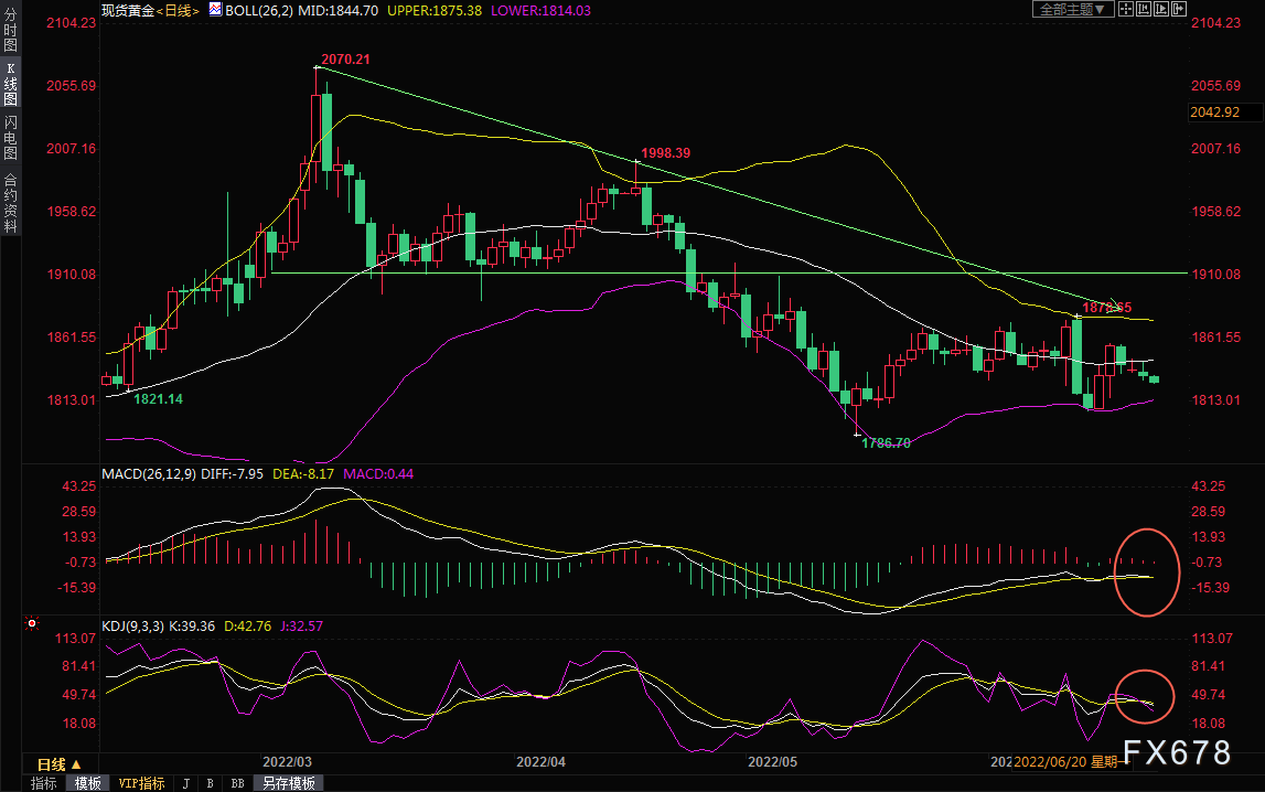 周三(6月22日)亚洲时段,现货黄金震荡微跌,一度创四个交易日新低至1826.45美元/盎司,美联储巴尔金支持7月加息50或75个基点,美国财长耶伦淡化经济衰退预期,美国国债收益率略微走高,美国股市出现小幅反弹,都给黄金带来一些压力。但地缘局势相对紧张,美国成屋销售数据表现不佳,仍给金价提供一些支撑。