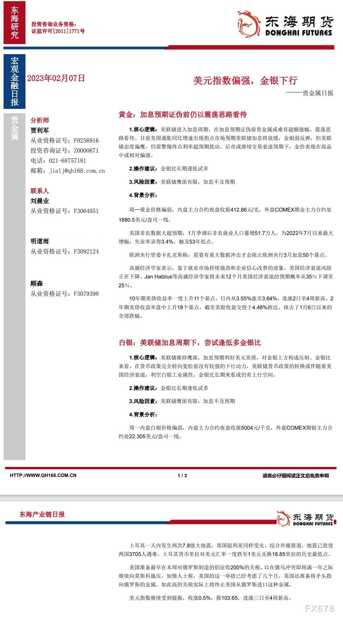 【东海期货2月7日产业链日报】贵金属篇:美元指数偏强,金银下行|期货