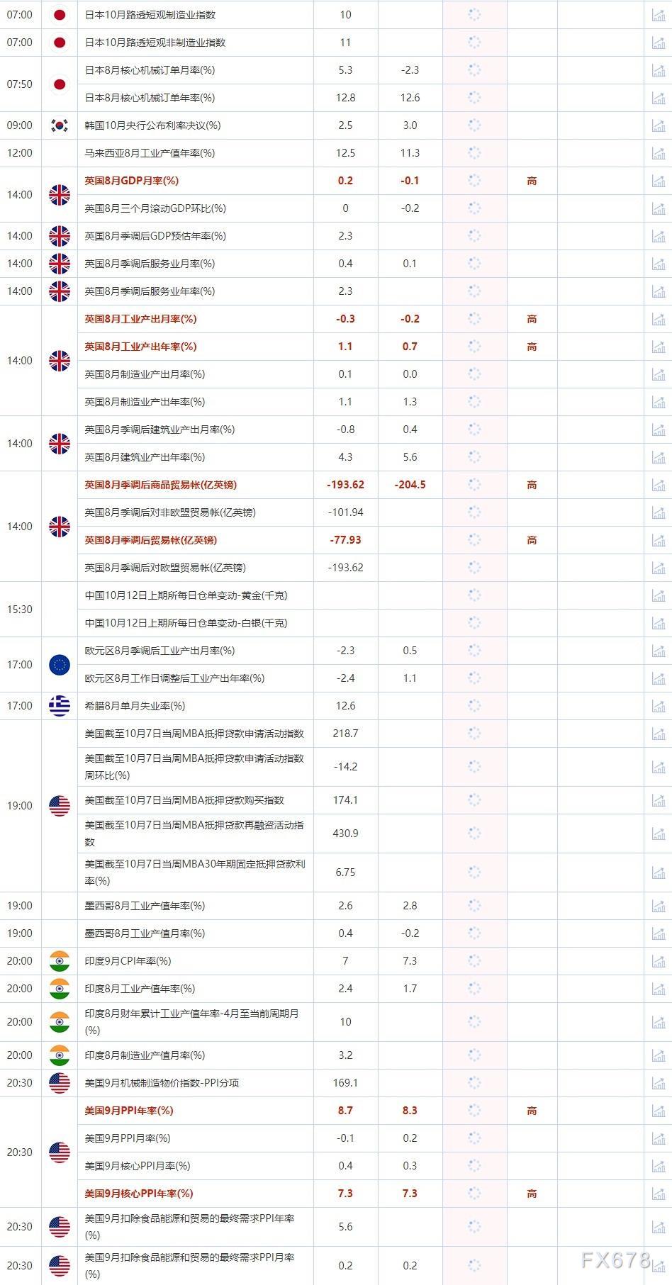 2022年10月12日,全球主要经济体将公布经济数据,需重点关注英国8月GDP月率,英国8月工业产出月率,英国8月工业产出年率,英国8月季调后商品贸易帐,英国8月季调后贸易帐,美国9月PPI年率, 大事方面需关注:韩国央行公布利率决议,OPEC公布月度原油市场报告,欧洲央行行长拉加德发表讲话,明尼阿波利斯联储主席卡什卡利发表讲话,G20财长和央行行长会议举行,至10月13日。