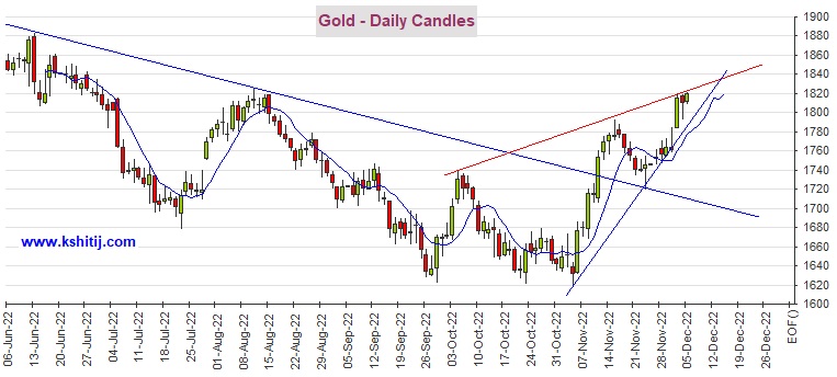 24K99讯 周一(12月5日)亚市盘中,黄金期货维持大涨走势,期金现报1822美元/盎司附近,日内涨约12美元。Kshitij咨询服务团队(Kshitij Consultancy Service)周一最新撰文,对黄金期货、白银期货、原油期货和铜期货后市走势进行前瞻分析。