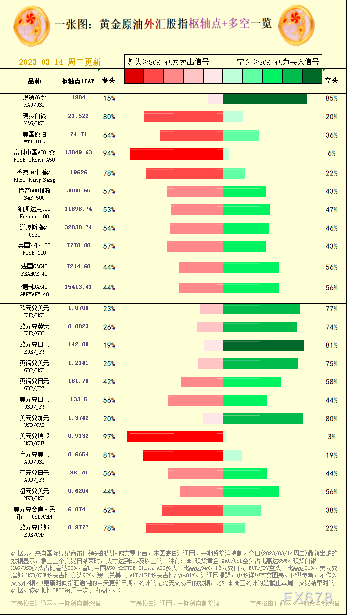 一张图:黄金原油外汇股指"枢纽点+多空占比"一览(2023/03/14周二)
