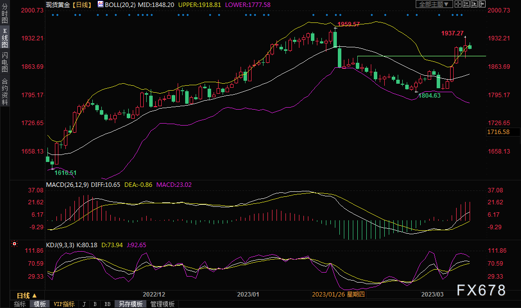 整体来看,对欧美国家银行业危机的担忧料将继续给金价提供避险支撑,而对美联储、欧洲央行、英国央行暂停加息的预期也有所升温,也偏向利多金价,金价后市仍有进一步冲高机会,分别关注隔夜高点1937和2月份高点1960关口附近阻力。