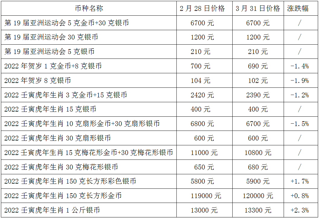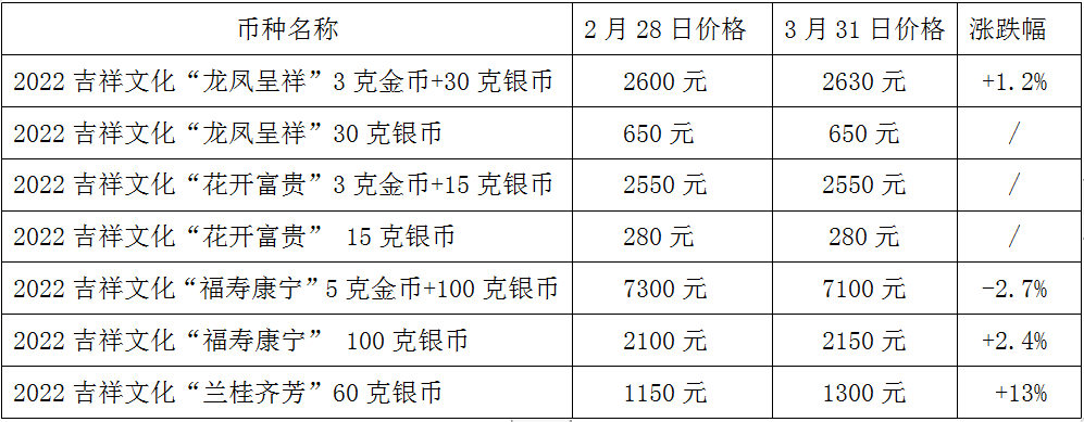 2022吉祥文化金银币各币种本月的价格变化如下: