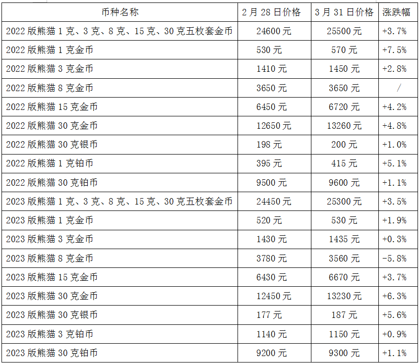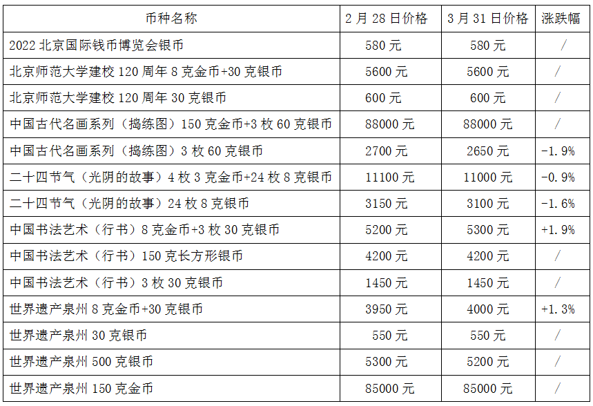 受到国际黄金、白银价格波动及市场货源的影响,2022版熊猫贵金属纪念币各币种的价格在2月涨跌互现,价格变化如下: