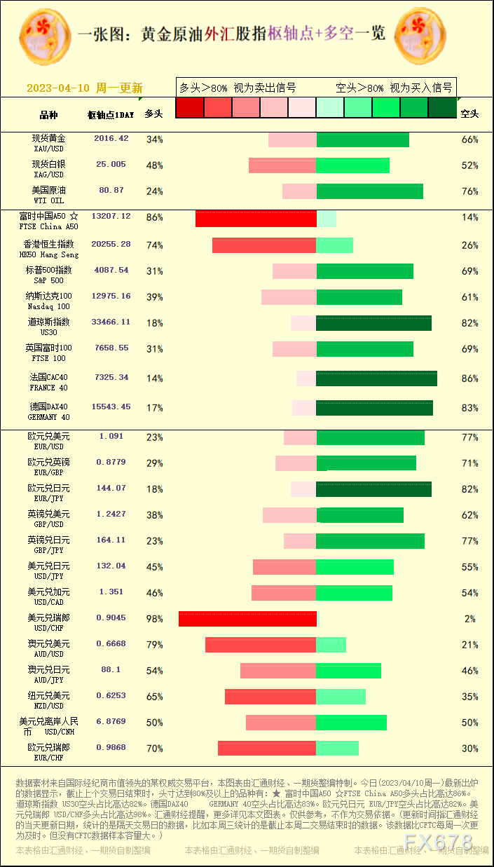 一张图:黄金原油外汇股指"枢纽点+多空占比"一览(2023/04/10周一)|美元