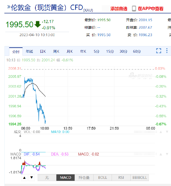 4月10日市场开盘后,现货黄金价格大幅跳空低开约16美元,至1990美元/盎司附近。随后金价大举反弹至2005美元/盎司左右,目前现货黄金再次跌向1995美元/盎司。