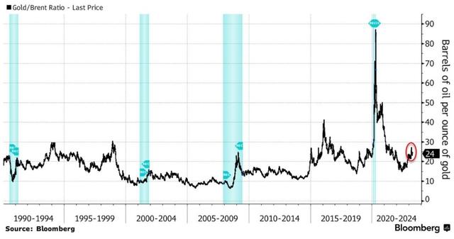 黄金与石油的价格之比已飙升至近24,远超2000年以来不足17的平均水平。市场参与者将显著高于均值的情况视为衰退将至的信号。此前的金融危机、1990年代的经济衰退时都有这种趋势。