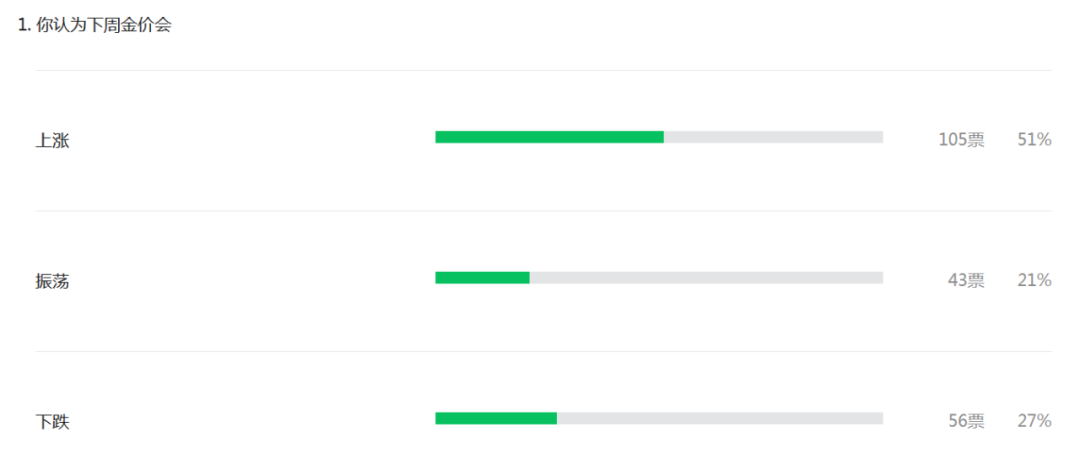 北京黄金经济发展研究中心调查显示,市场人士对本周国际金价走势看法分歧较大。投票显示,有51%的读者看涨本周金价、21%看振荡、27%看空。