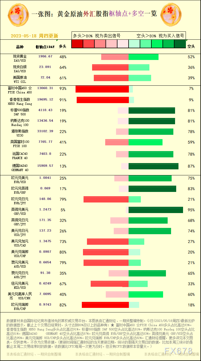 一张图:2023/05/18黄金原油外汇股指"枢纽点+多空占比"一览|美元