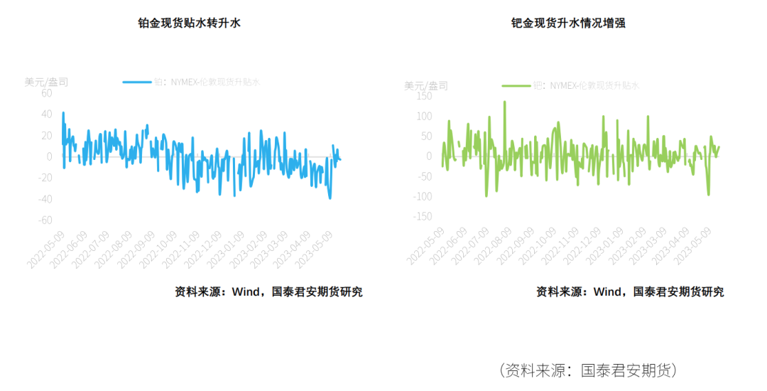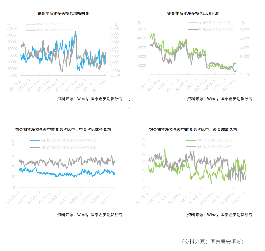 资料来源:Wind,国泰君安期货研究在期货持仓变动方面,截至5月16日,铂金总持仓较上一周减少715张,其中非商业多头方面减少1750张,非商业空头持仓小幅增加,较上一周增加511张,涨幅达3.75%。因此,非商业净多头持仓减少2261张,出现下滑,降幅达8.05%。在净持仓多空前8名占比上,铂金方面净持仓多头占比增加0.1%,空头占比减少0.7%。钯金方面,截至5月16日,总持仓减少534张,其中非商业多头持仓增加49张,空头减少682张,因而非商业净多持仓增长731张,达12.95%。在净持仓多空前8名占比上,钯金方面多头占比增加2.7%,空头占比减少1.2%。