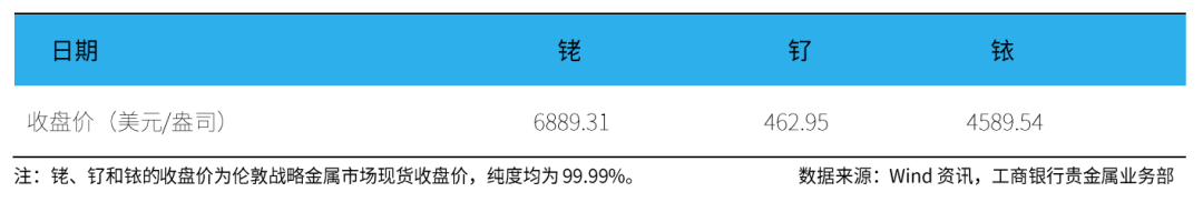 伦敦现货铑(99.99%)收盘价为6889.31美元/盎司,周累计下跌8.01%。