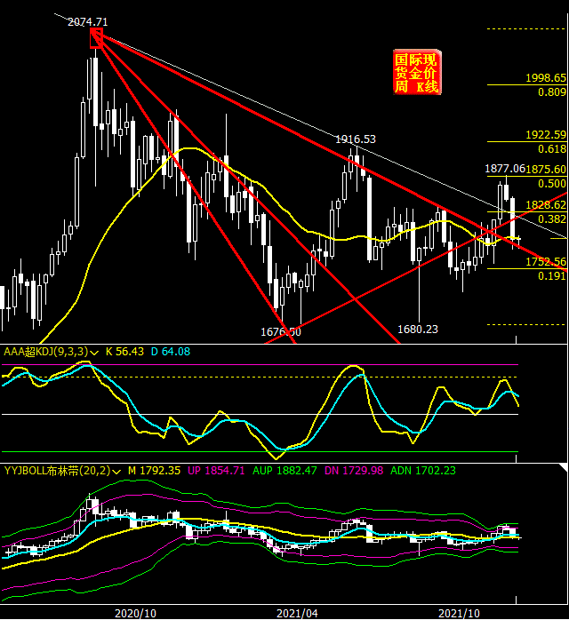 周五金价反弹和避险情绪回归共振,亚市突破1800美元关口并在欧市强化升势。美盘在大宗商品溃败走势拖累影响下,回撤宽幅震荡整固,日线收呈上影小阳线,连续四个交易日回撤稳定于2074以来速阻线2/3线上方整固。如下图示:本周受周一大幅深幅回撤影响,周线收呈的下影中阴线,周跌2.93%创6月18日来最大单周跌幅,周综合技术指标相对高位回落,发出偏空讯号;本月金价突破2074以来速阻线2/3线后再次回撤测试该支撑线,收盘企稳于周线布林中轨带区域,初显企稳迹象。与此同时,前期上行中完美错失的黄金ETF--SPDR Gold Trust在本轮金价趋顶和回撤过程中,持仓出现累积5次连续增持,带有较为明显的低位增持操作意图。(杨易君黄金与金融投资)