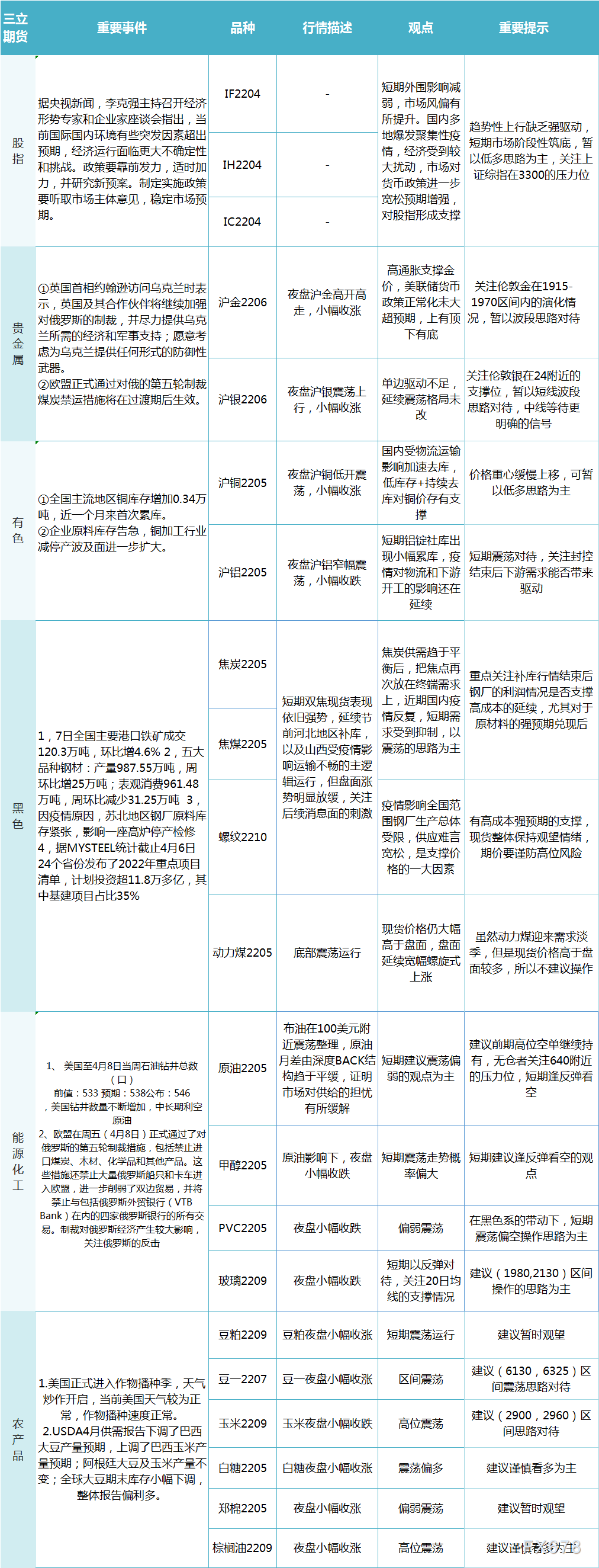 三立期货4月11日早评:一张图尽览股指、贵金属、能源化工、农产品、有色和黑色系预测|期货 来源:正大期货 作者:正大国际期货 时间:2022-04-11 三立期货4月11日早评:一张图尽览股指、贵金属、能源化工、农产品、有色和黑色系预测。