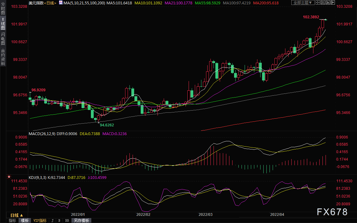 美元指数周二收涨0.6%,日线录得四连阳,周三目前最高触及102.39,为2020年3月以来新高。