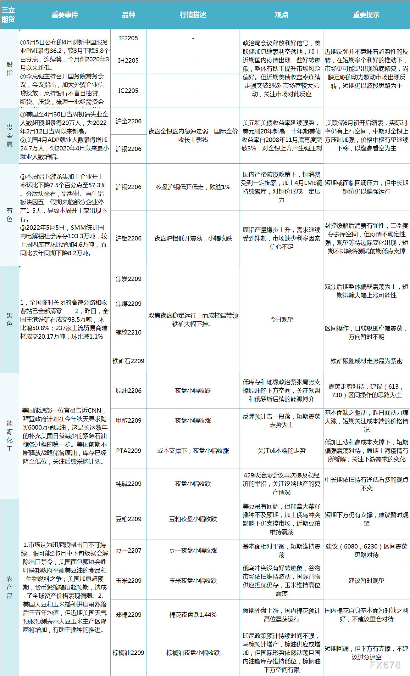 三立期货5月6日早评:一张图尽览股指、贵金属、能源化工、农产品、有色和黑色系预测|期货 来源:正大期货 作者:正大国际期货 时间:2022-05-06 三立期货5月6日早评:一张图尽览股指、贵金属、能源化工、农产品、有色和黑色系预测。