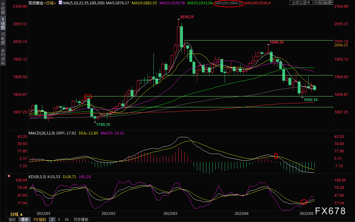 由于KDJ已经低位初步金叉,如果金价能够收盘于1900关口上方,则增加短线看涨信号。此外100日均线1883.40再次转化为初步阻力所在。
