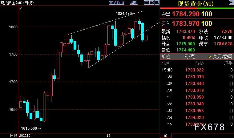 汇通财经APP讯——本周,现货黄金一度创下6月底以来新高至1824.39美元/盎司,但随着全球多家央行先后提高利率,并准备在更长时间内继续加息以应对高通胀,金价回吐全部涨势并转跌,几乎铁定收低。全球央行鹰派前景恶化经济前景,引发风险厌恶情绪,支撑了美元需求,美元指数自周内创下的6月中旬以来新低103.437反弹,收复周内多数跌势。截至发稿,现货黄金下跌0.72%至1784.14美元/盎司;COMEX期金主力合约下跌0.86%至1793.8美元/盎司;美元指数下跌0.46%至104.452。