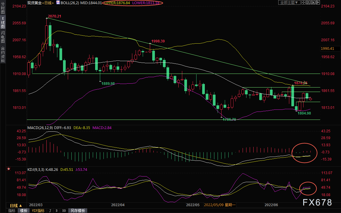 日线级别:震荡;KDJ轻微金叉,MACD粘合,均线交织,金价在布林线中轨附近徘徊,短线走势变数较大,后市留意布林线轨道1811.23-1876.87区域突破情况。