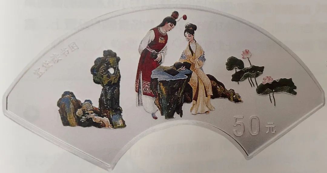 宝黛读书银币币面图案取材于《红楼梦》第23回“西厢记妙词通戏语 牡丹亭艳曲警芳心”。图案中贾宝玉、林黛玉二人可谓心灵相通、心心相印。