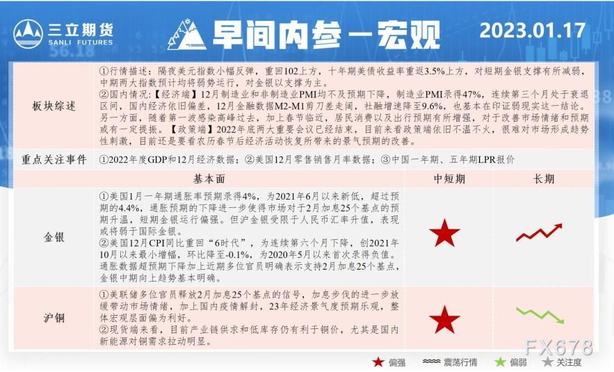 三立期货1月17日早间内参——宏观|期货 来源:正大期货 作者:正大国际期货 时间:2023-01-17 汇通财经APP讯——三立期货早间内参显示,金银中短期偏向多头,长线偏多;沪铜中短线偏向多头,长线偏空。三立期货期货公司授权文本由“专注期货开户交易及专业行情分析资讯网站”【一期货www.1qh.cn】转发。