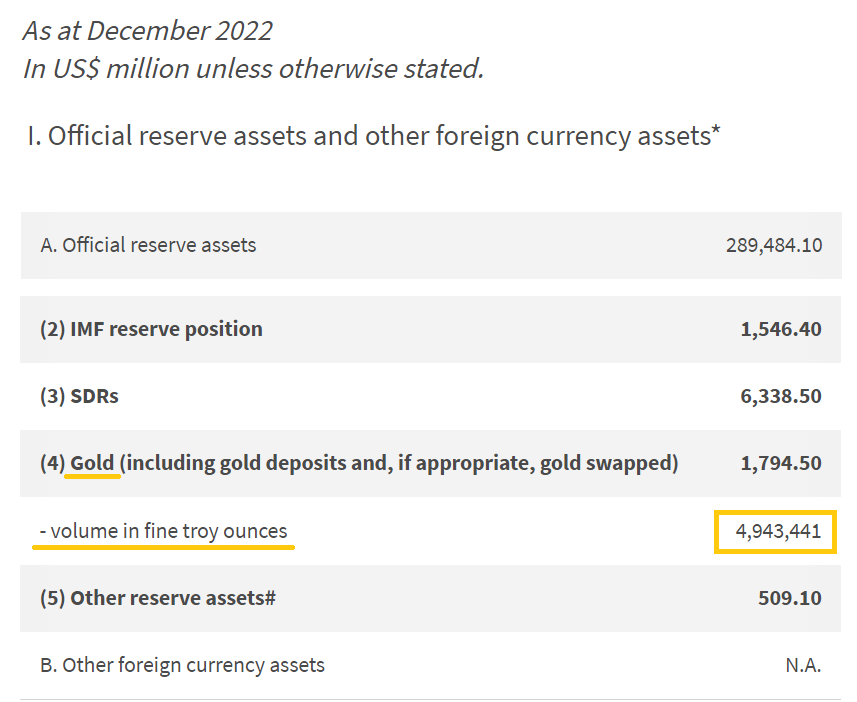 查看本报告的2022年12月版本显示,2022年12月,“黄金包括黄金存款,如果适用,还包括黄金掉期”储备资产的交易量为4943441盎司。