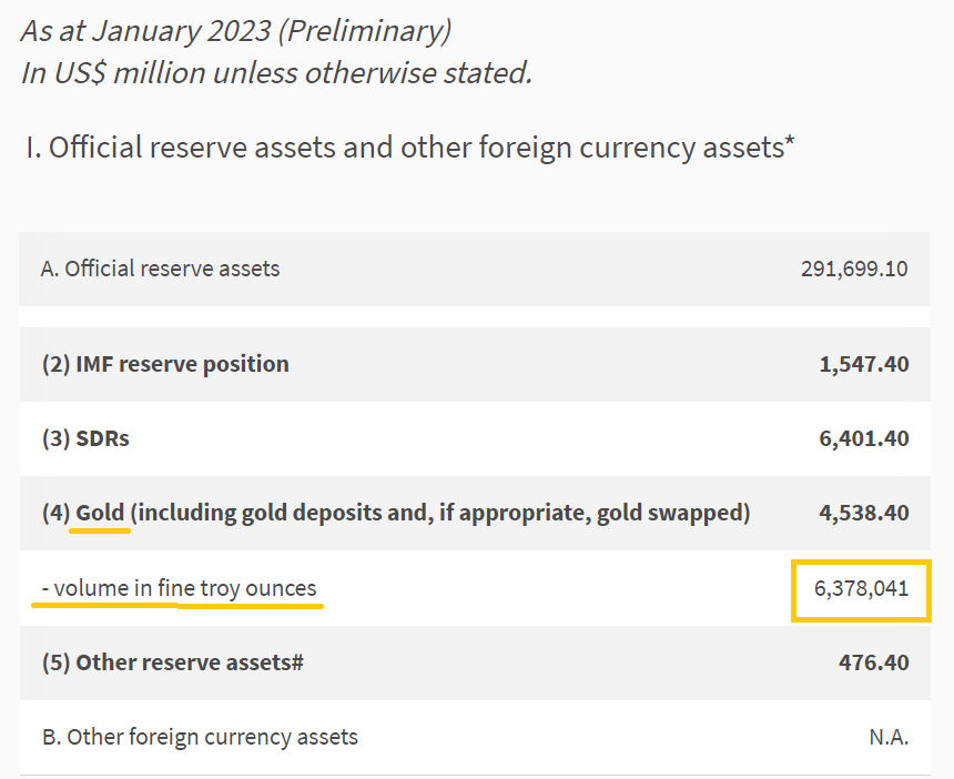 然后,当2月底发布2023年1月版本的报告时,它现在显示黄金的精金衡盎司量为6378041盎司。增加1434600盎司,即44.62吨。按百分比计算,增长29.02%。