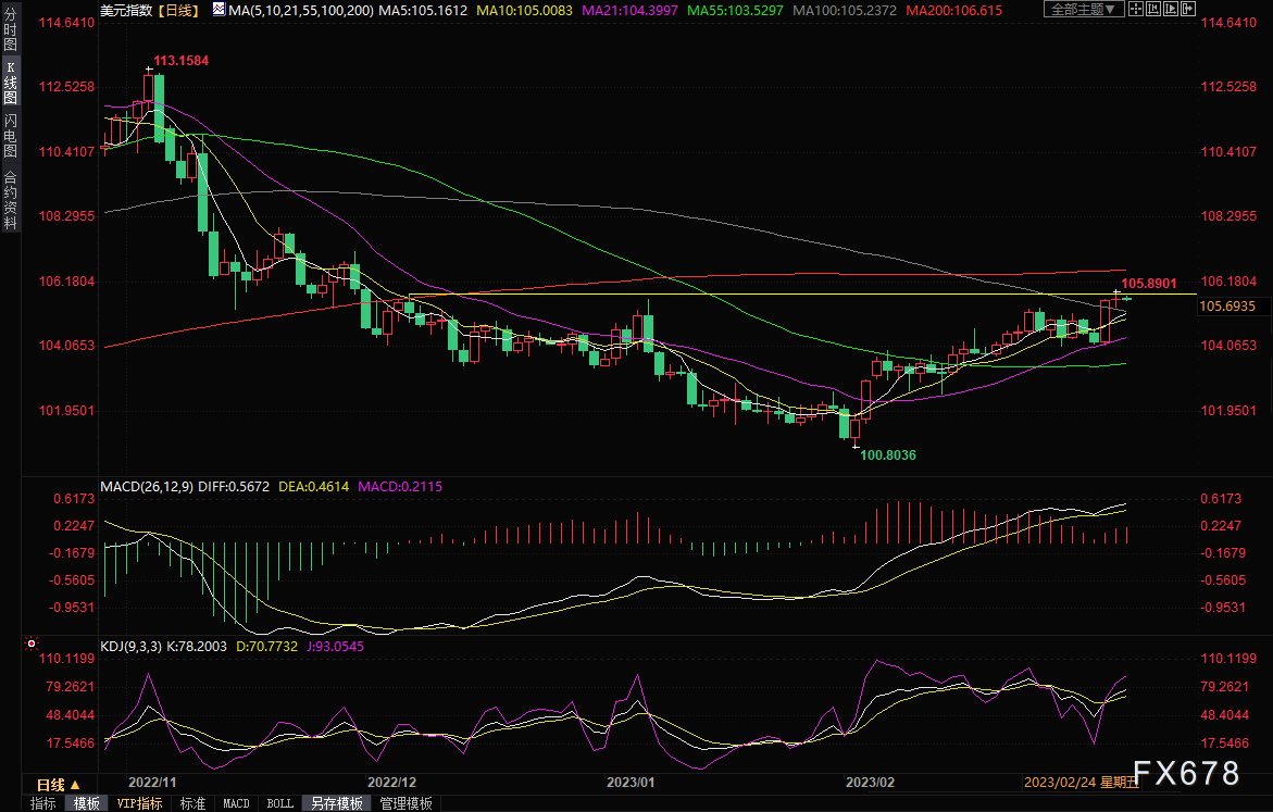 美元指数周三尾盘持平于105.63,早些时候达到105.89,为12月1日以来最高。它从2月1日的九个月低点100.80上升,但仍远低于9月28日达到的20年高点114.78。