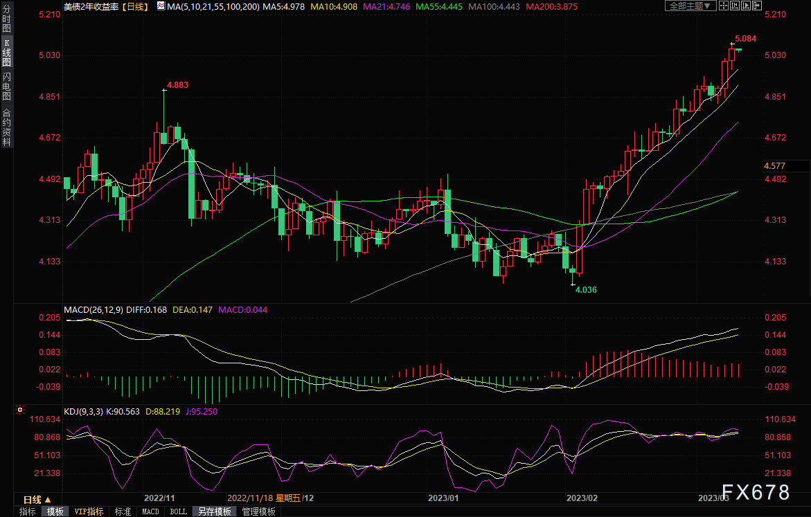 在鲍威尔发言后,较短期公债收益率在周二跳涨,在周三继续上涨,2年期国债收益率一度触及5.084%的2007年6月15日以来最高,收盘上涨1.1%,收报5.066%。