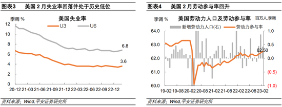 美国2月失业率回升至3.6%;劳动参与率回升0.1个百分点。美国2月U3失业率由前值3.4%的历史低点回升至3.6%,U6失业率由6.6%回升至6.8%。2月劳动参与率回升0.1个百分点至62.5%,对应新增劳动力41.9万人,是2022年平均水平的两倍左右,近三个月美国劳动力人口修复速率加快。