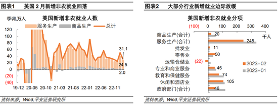 美国2月新增非农就业较1月放缓、但仍高于预期,基本持平于近半年以来的平均水平。美国时间2023年3月10日公布的就业数据显示,美国2月新增非农就业31.1万人,高于预期的22.5万人,但较1月的50.4万人(调整后)明显回落,基本持平于2022年8月以来的月度平均水平。结构上,2月商品生产(2万,前值5.1万)、服务生产(24.5万,前值33.5万)以及政府部门(4.6万,前值11.8万)的新增就业人数较1月均有所回落。细分行业中,大部分行业新增就业边际放缓,仅批发、零售等行业新增就业小幅上升。