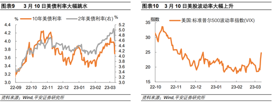 就业数据边际降温,叠加硅谷银行暴雷事件助推,市场似乎呈现“衰退交易”,但其持续性或不足。3月10日,10年美债收益率由前值3.93%大幅下降约23BP,至3.7%附近,2年美债收益率大跌30BP,至4.6%。美股三大指数当日跌幅均超过1%,纳斯达克指数跌1.76%,标普500波动率指数(VIX)跃升至24.8、创年内新高,硅谷银行宣告破产、以及相关流动性担忧使美股银行板块遭遇抛售,进一步冲击美股。美元指数日内跌0.56%,至104.65。金价日内涨2.06%,至1867美元/盎司。