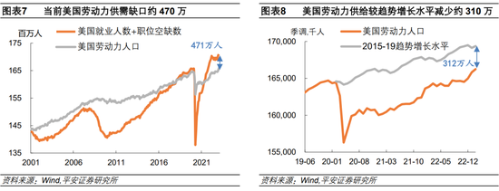 我们测算,美国2月劳动力供需缺口约470万,其中供给不足贡献约310万。我们以2月美国就业人数(家庭调查,季调)和1月职位空缺数(JOLTS调查,季调)二者之和作为“劳动力需求”,以劳动力人口(家庭调查,季调)作为“劳动力供给”,测算得到当前美国劳动力“供需缺口”为471万人。美国劳动力供需缺口已连续第二个月呈现扩大趋势,即使劳动力供给在稳步修复,但劳动力需求增长的速度更快,这凸显了美国就业市场仍然火热。因此,我们认为美国就业市场暂不具备大幅降温的基础,失业率可能尚未步入趋势回升通道。