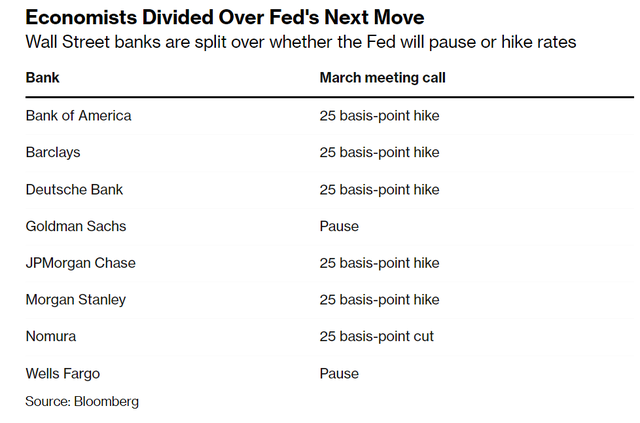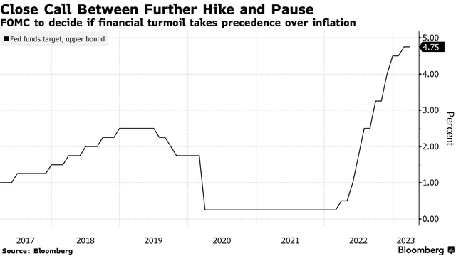 鲍威尔及其同事们已经开始了他们的会议,但是会议结果异常不明朗。虽然大多数经济学家预计利率将上调25个基点,但一些人表示,政策制定者应该暂停加息,以支撑金融稳定。